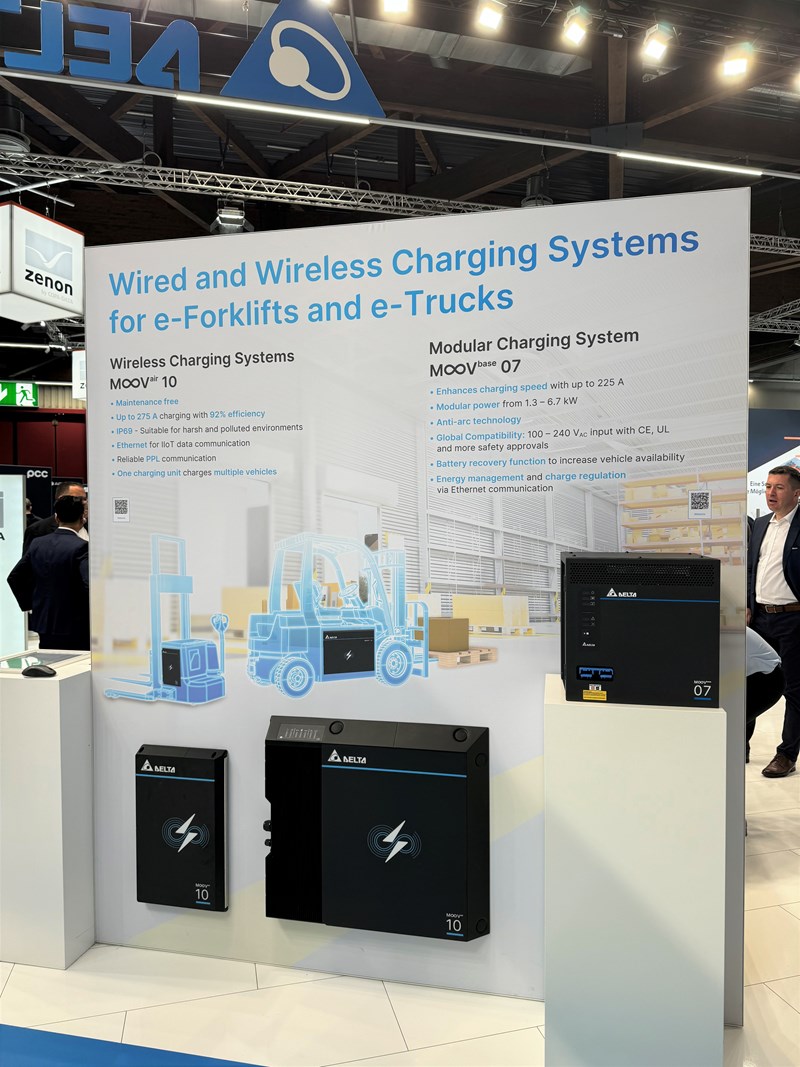 Delta continued to push the boundaries of autonomous electric vehicle charging with the M∞Vair Series wireless charging systems. The Series showcased its 1kW, 3.3kW, and 10kW models, all with a primary system for AC connection and an onboard system to charge vehicle batteries. The Series also features a gap of up to 150 mm compatibility with both lead-acid and lithium batteries, and 93% efficiency. The 1kW and 3.3kW models are ideal for AGVs and AMRs, while the 10kW model is tailored for high-power vehicles such as forklifts and ground support equipment.