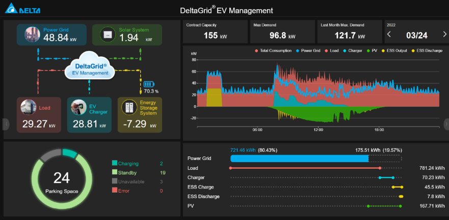 Delta’s Europe headquarters in Hoofddorp, the Netherlands, is located in a building that is over 35 years old. When the building was first constructed, demand for EV charging was simply not a consideration. Its power configuration was thus limited, making substantial reconstruction difficult. However, in October 2021, Delta was able to install 16 chargers in the building’s parking lot by leveraging rooftop PV and energy storage systems. Since their activation, there have been zero power overload incidents, and the building’s total energy cost has been reduced by 15.64%. The key to this success lies in the implementation of DeltaGrid® EVM, a EV charging management system that leverages software and AI in energy deployment to consolidate smart charging. It is one of the few charging management systems on the market to integrate chargers, PV, energy storage, and load management in a single platform.
